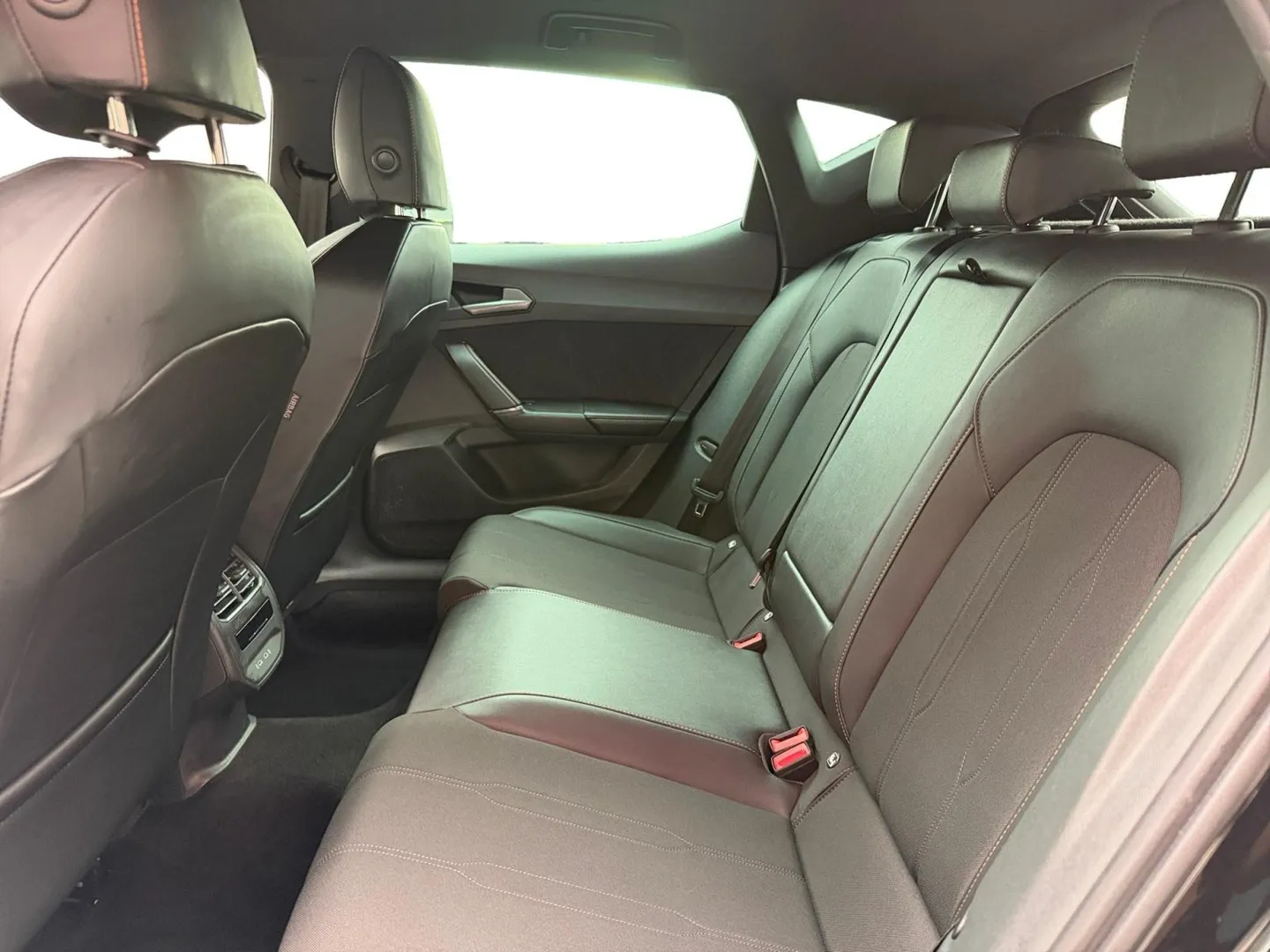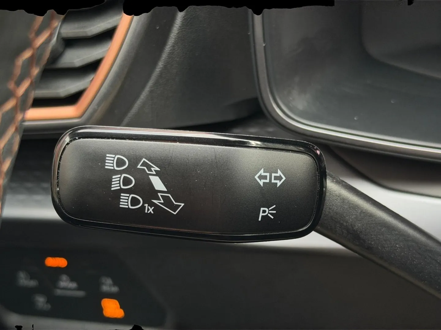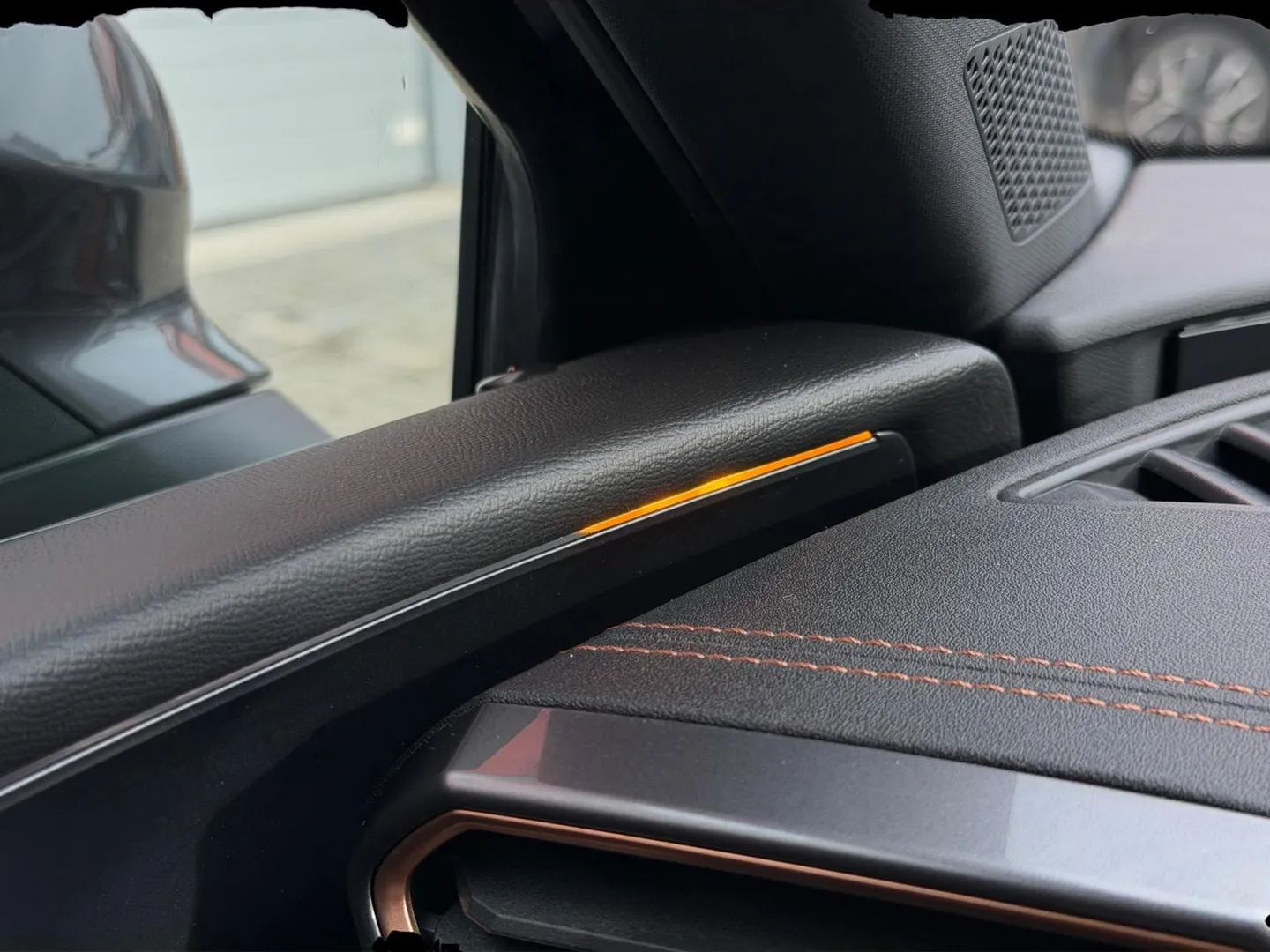 Deze zwarte Cupra Leon onderscheidt zich met 18-inch ‘Garbi’ lichtmetalen velgen en Full-LED koplampen die het sportieve karakter onderstreken. De bumpers in carrosseriekleur en de achterspoiler geven de stationwagon een dynamische uitstraling, terwijl de glanzende exterieuronderdelen het premium karakter benadrukken. De mistlampen werken adaptief mee met het stuurgedrag, een detail dat de technische verfijning verraadt. Het extra getinte glas combineert privacy met een strakke look.