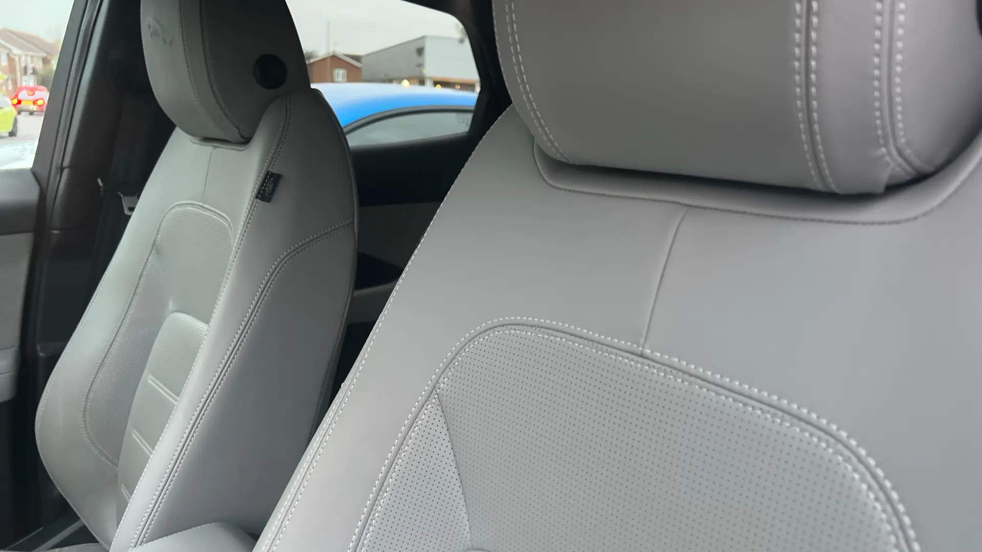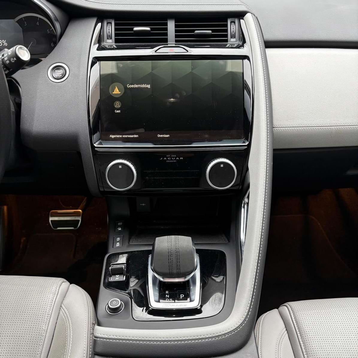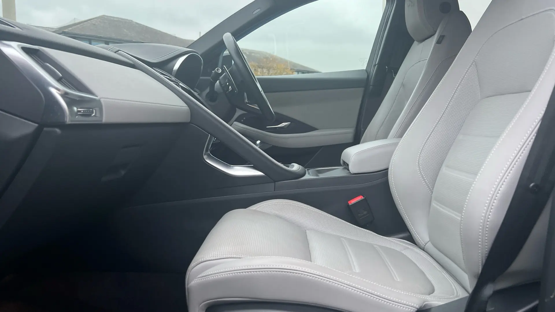 Het interieur is waar de E-PACE de meeste concurrenten in de hoek zet: Cloud lederen sportstoelen gecombineerd met een Ebony interieur zorgen voor een contrast dat zowel fris als chique oogt. Je kijkt uit op een 12,3-inch Interactive Driver Display, terwijl het 11,4-inch Pivi Pro-touchscreen in het midden de regie voert over de navigatie en Spotify via Apple CarPlay of Android Auto.