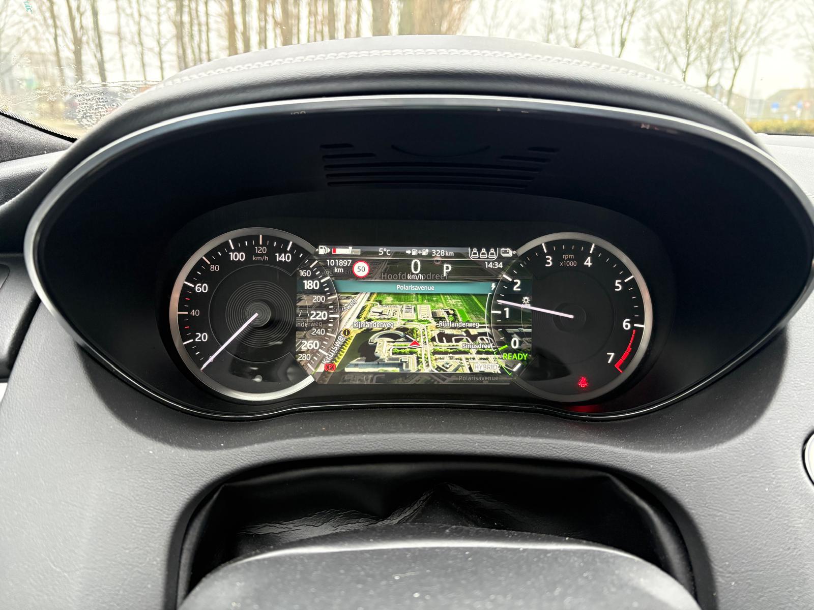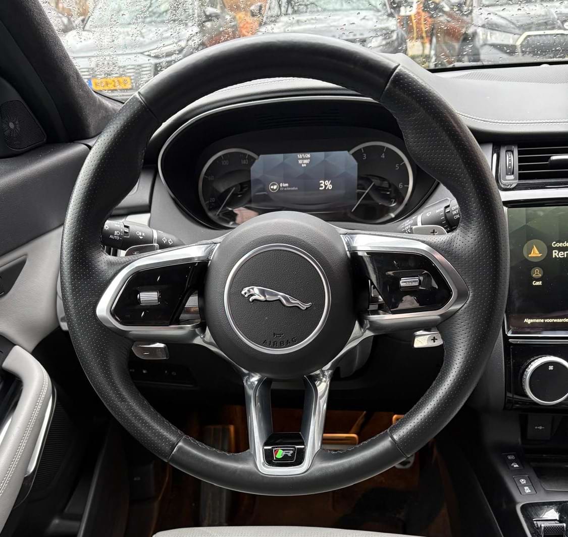 Jaguar belooft een WLTP-actieradius van 61 kilometer; in de praktijk moet je rekenen op ongeveer 45 tot 50 volledig elektrische kilometers. Het verbruik is sterk afhankelijk van je stekkerdiscipline: de fabriek geeft 1,5 l/100km op, maar reken bij een lege accu op een realistischer verbruik van 8 à 9 liter per 100 kilometer. Gelukkig beschikt deze E-PACE over een snellaadfunctie (DC), waardoor je de accu in ongeveer 30 minuten weer tot 80% vol hebt bij een publieke snellader.