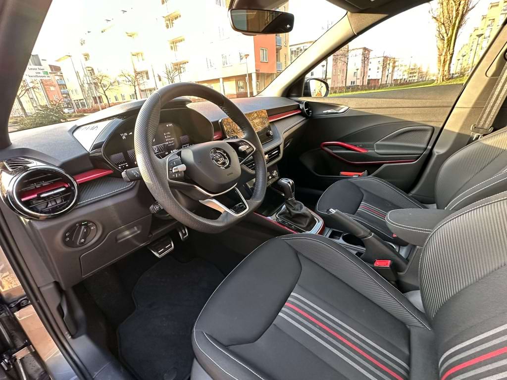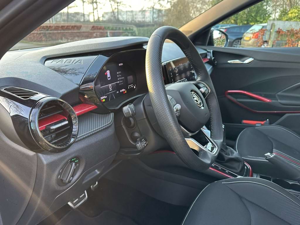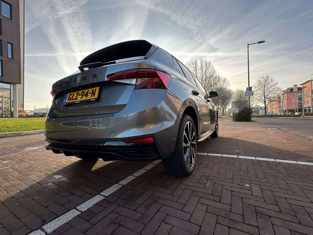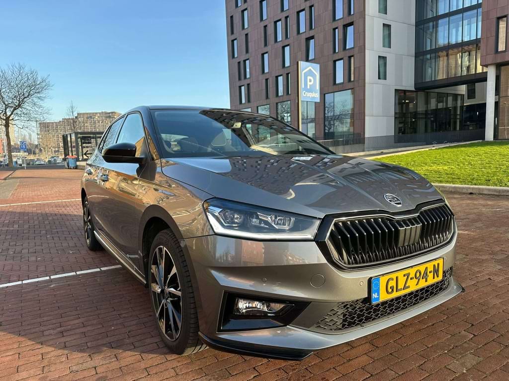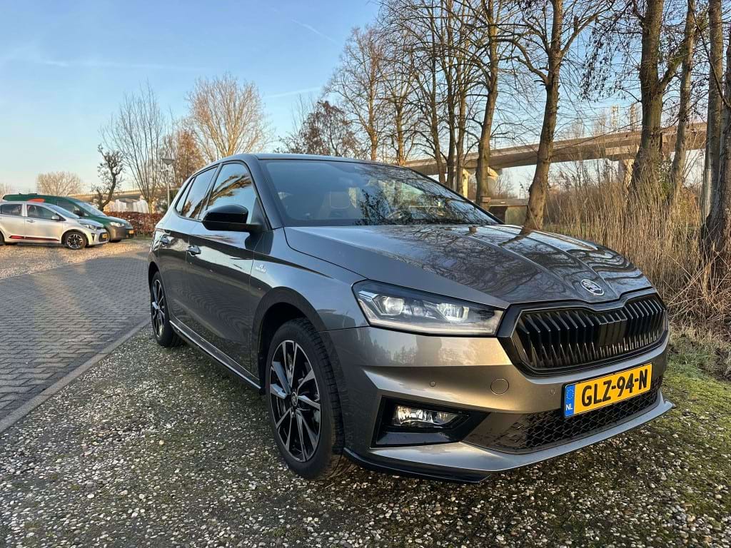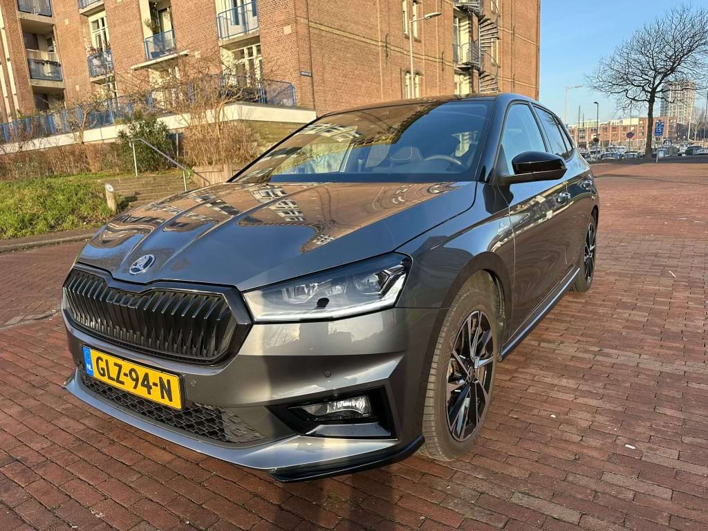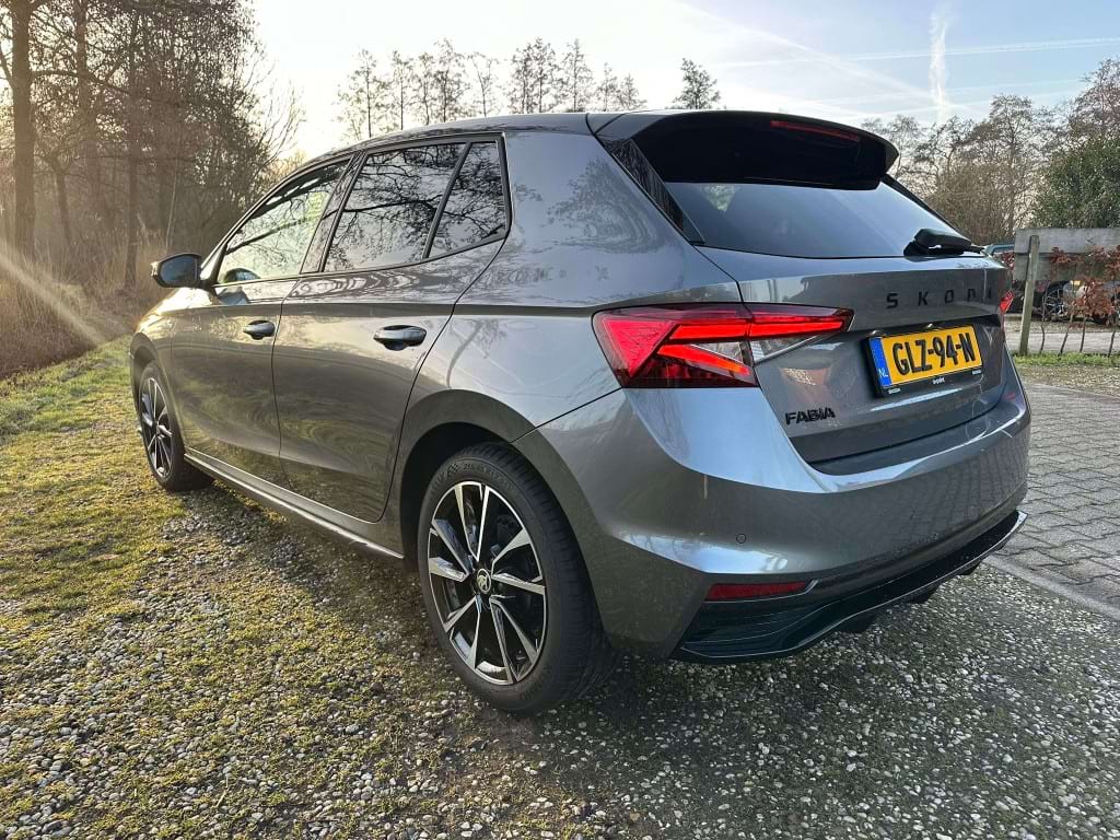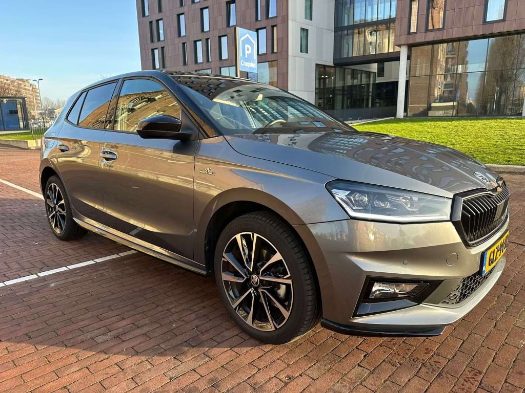 De Monte Carlo-uitvoering van de Skoda Fabia is niet voor de grijze muis die enkel van A naar B wil. Aan de buitenzijde springt de Graphite Grey metallic lak direct in het oog, scherp gecontrasteerd door het ‘Colour Concept Zwart’. Dit betekent dat de A-stijlen en het dak in Black Magic zijn uitgevoerd, wat samen met de 17-inch zwarte Procyon Aero-velgen zorgt voor een gedurfde, bijna agressieve look. Het optionele panoramadak trekt het daglicht naar binnen, waardoor de compacte Fabia binnenin verrassend ruimtelijk oogt.