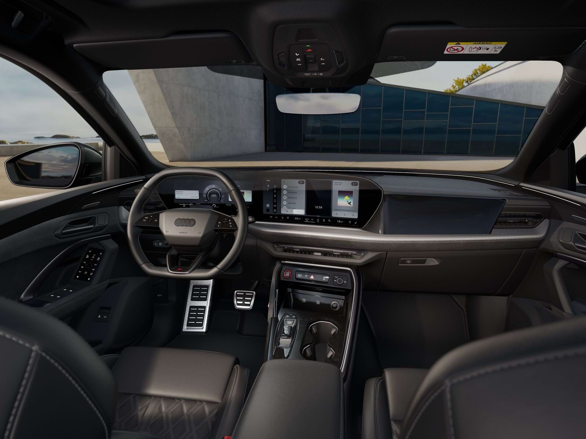 Binnenin wordt het pas echt interessant. Je zit op fijnlederen, verwarmbare sportstoelen die uiteraard volledig elektrische verstelbaar zijn. Het grote glazen panoramadak zorgt voor veel daglicht in het interieur, dat verder wordt gedomineerd door zwarte hemelbekleding en hoogwaardige materialen. Voor de audiofielen is het Bang & Olufsen Premium Soundsystem met 3D-geluid aanwezig. Het MMI experience plus systeem navigeert je feilloos langs de files, terwijl het ‘Tech pro’-pakket zorgt dat je qua assistentiesystemen helemaal bij de tijd bent.