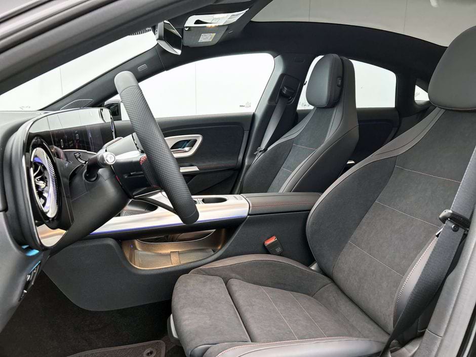 Aan de buitenzijde van de CLA 250+ Launch Edition wordt meteen duidelijk dat je niet voor de instapversie bent gegaan. De auto is uitgevoerd in het chique Kosmoszwart metallic en staat op forse 18-inch lichtmetalen velgen die de gestroomlijnde wielkasten perfect opvullen. De verlichte grille is een subtiele knipoog naar het moderne Mercedes-design, terwijl de auto dankzij de 4-deurs coupé-lijn een stuk dynamischer oogt dan de gemiddelde zakelijke sedan.